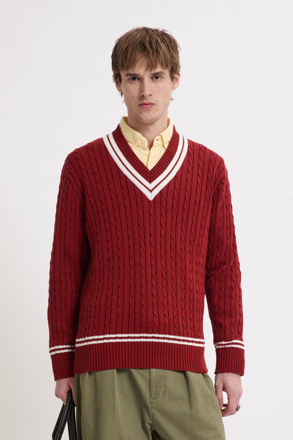 • Der Cricket V‑Neck besteht aus 100 % Baumwollstrick im Cable‑Knit‑Design – weich im Griff und zugleich robust genug für den täglichen Einsatz.