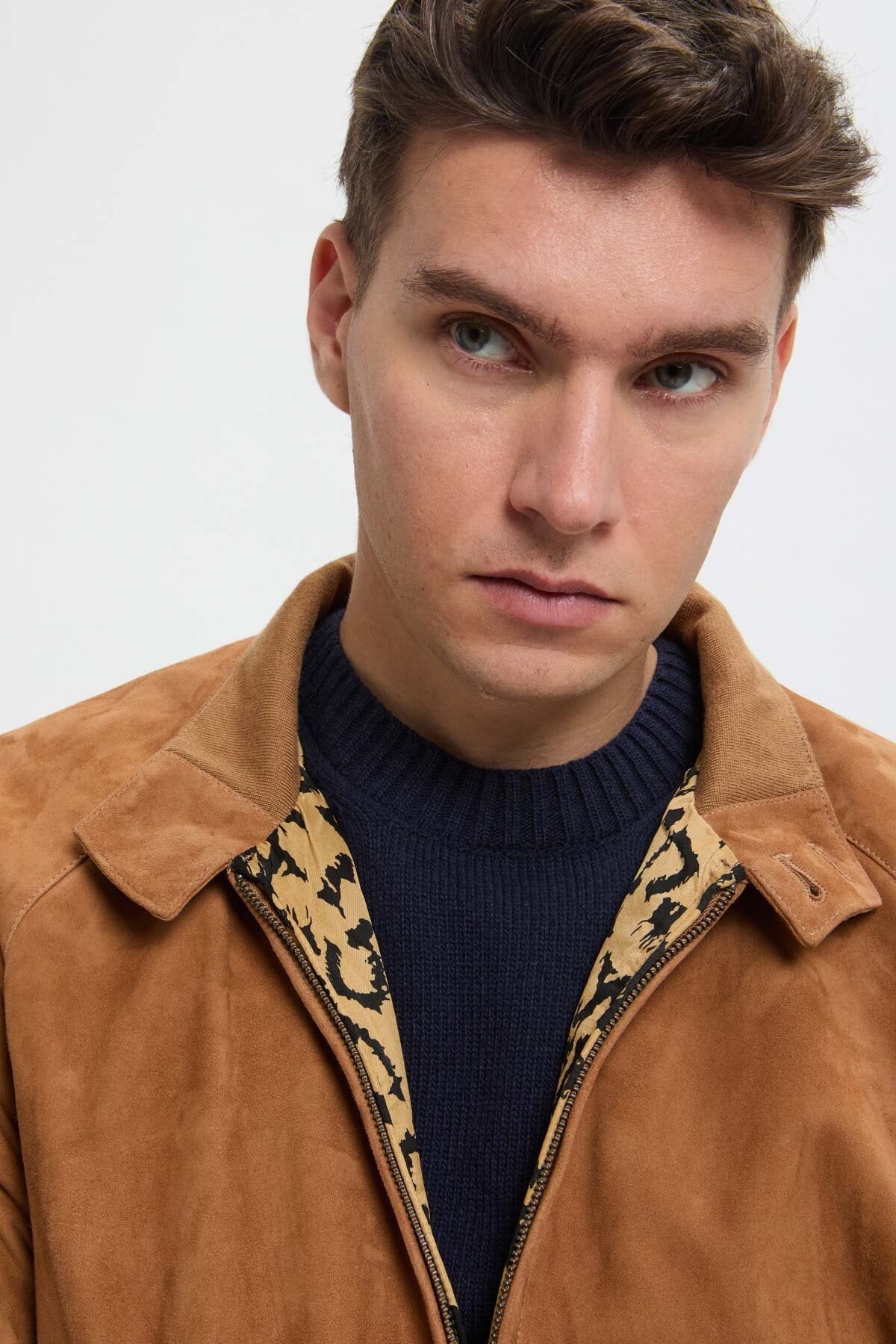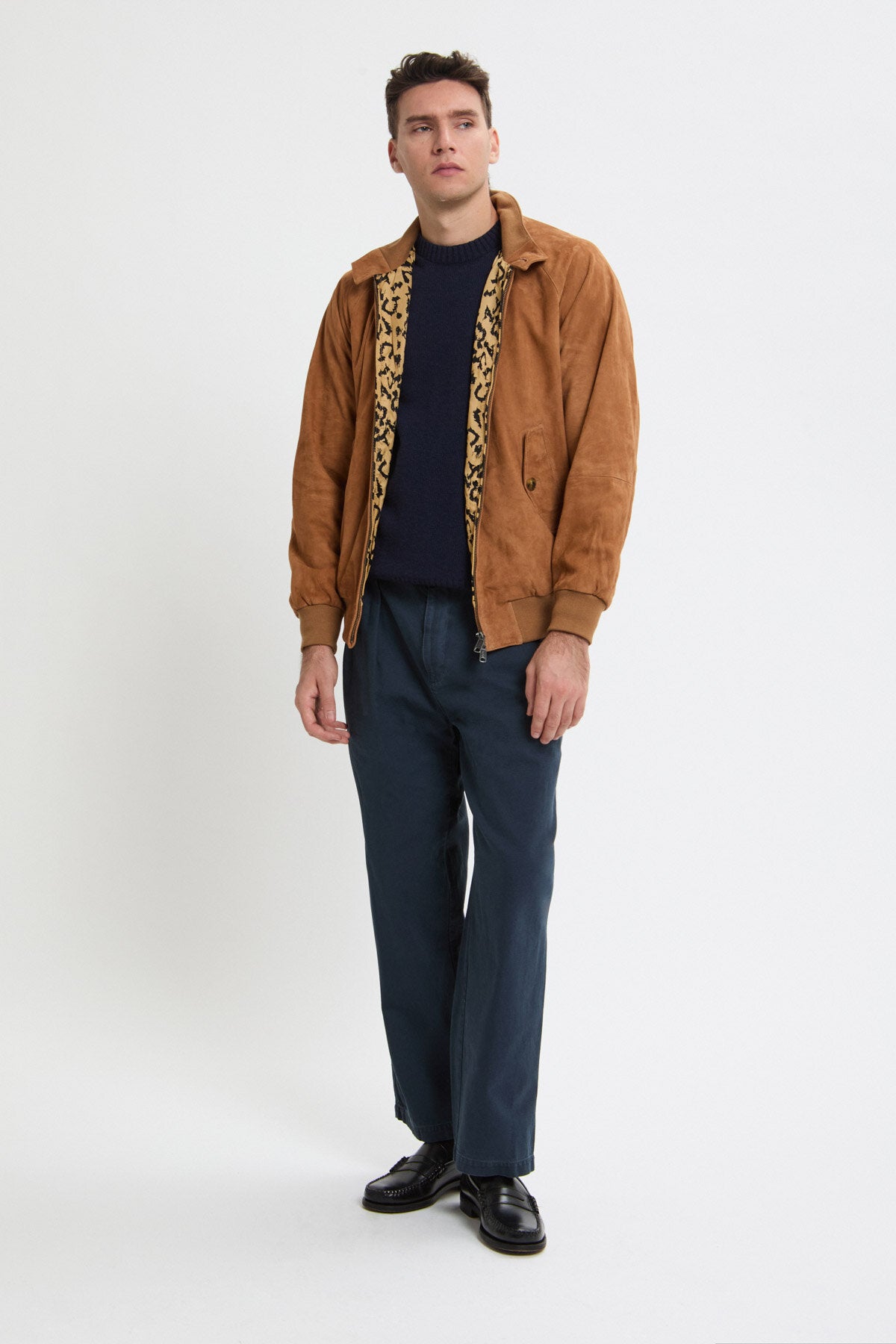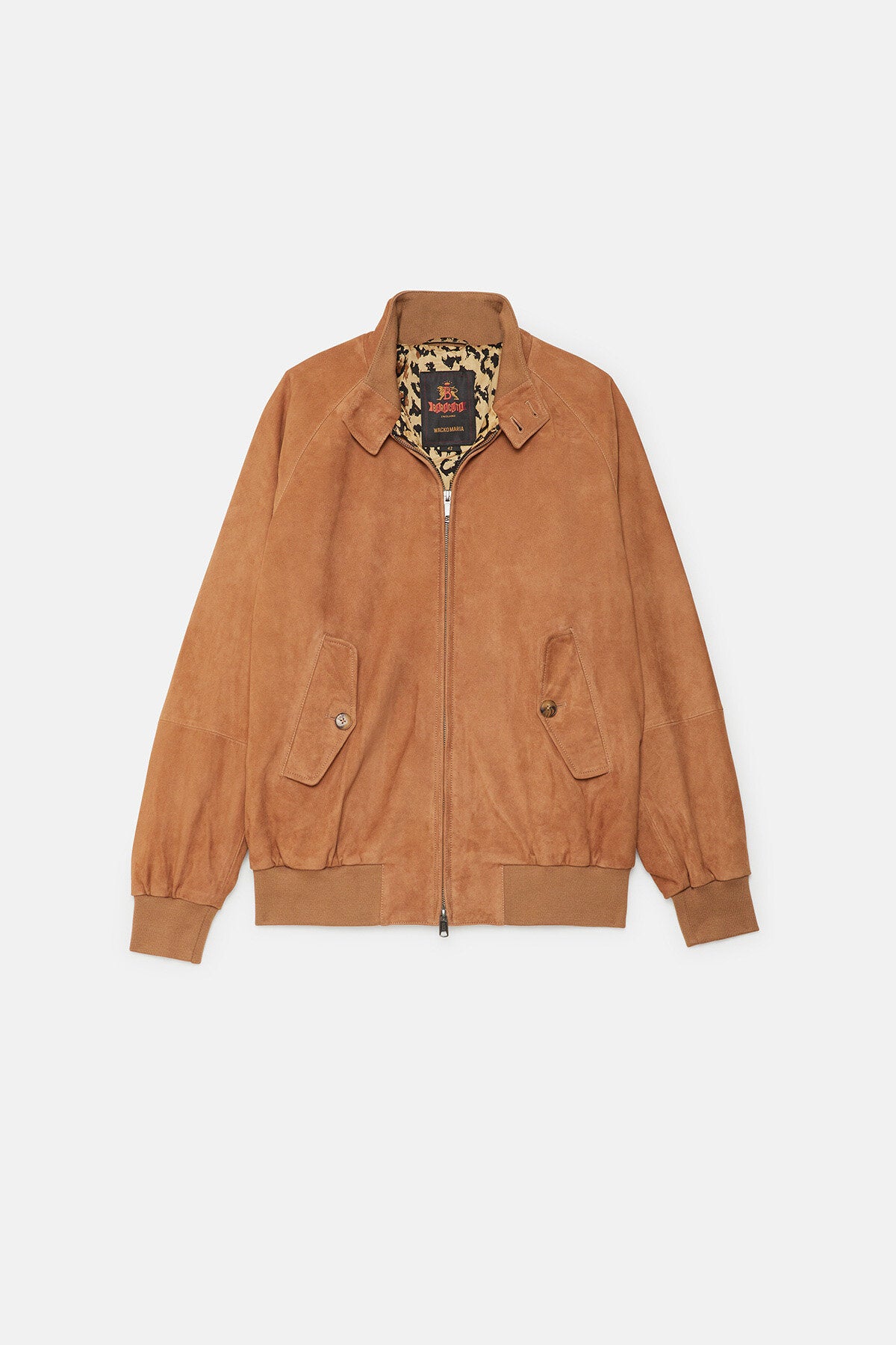 • Il G9 in pelle scamosciata in collaborazione con Wacko Maria fa il suo ritorno in un'accattivante versione con stampa animalier in tre fantastiche varianti cromatiche: Black, Tobacco e Chocolate. L’esterno della giacca è realizzato in pelle scamosciata premium di Baracuta, mentre l'iconica fodera con stampa leopardata all'interno conferisce al modello il tocco inconfondibile di Wacko Maria. Completa il tutto il discreto dettaglio con passante a catena in metallo. Il capospalla presenta inoltre un design moderno e un taglio più ampio, che donano al modello un look versatile e unisex.