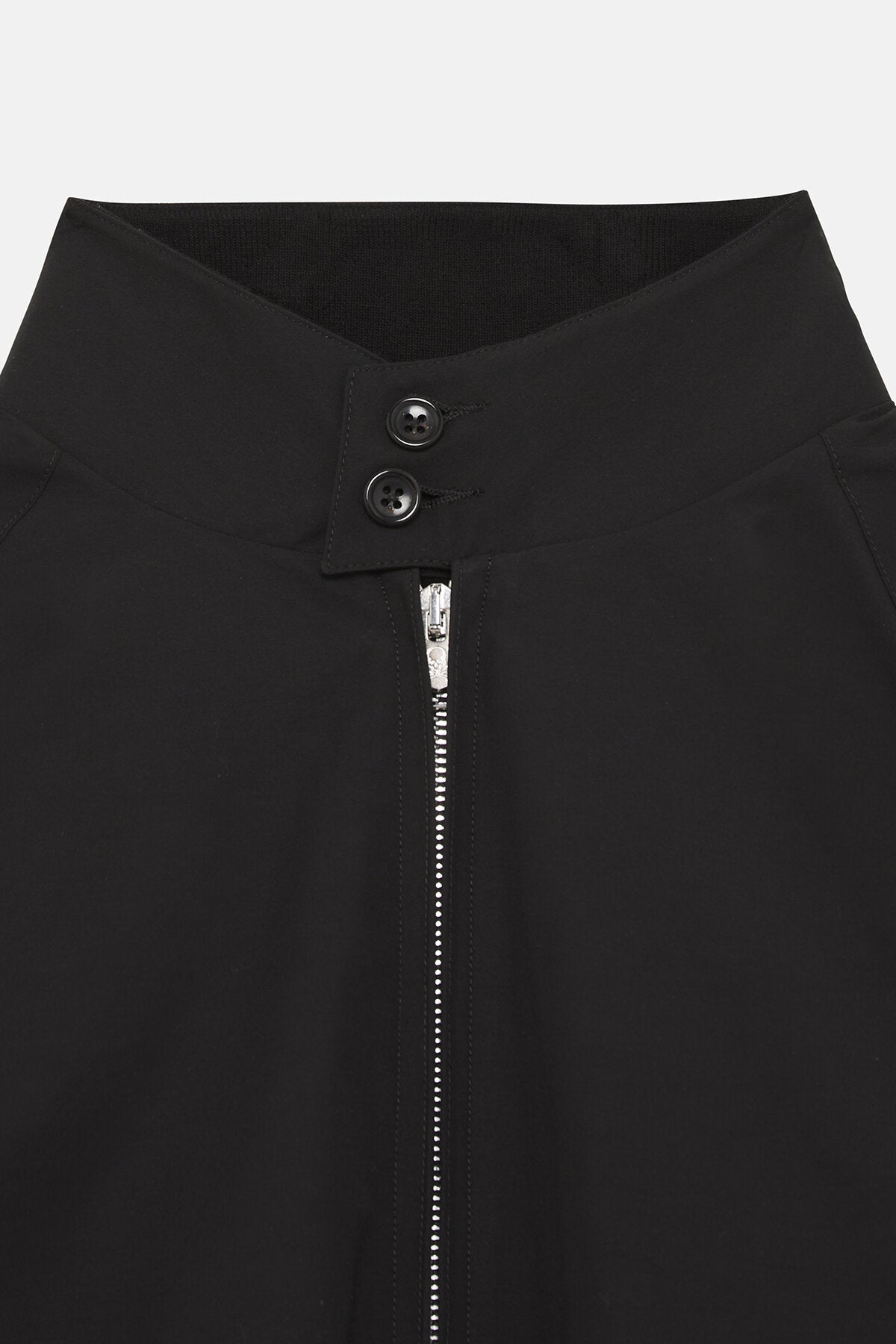 • • Collo in piedi a coste sottili, tono su tono, con chiusura a doppio bottone con marchio Baracuta